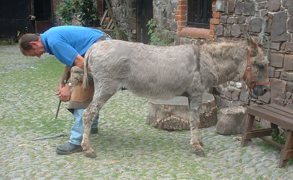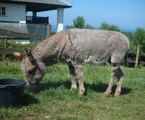 In 1999 Oscar developed a hormone problem that stops him growing his summer coat properly. This means he looks strange all summer and often wears a rug so that he is not cold. He is still a dear donkey and we love him just as much even if he is a bit bald!